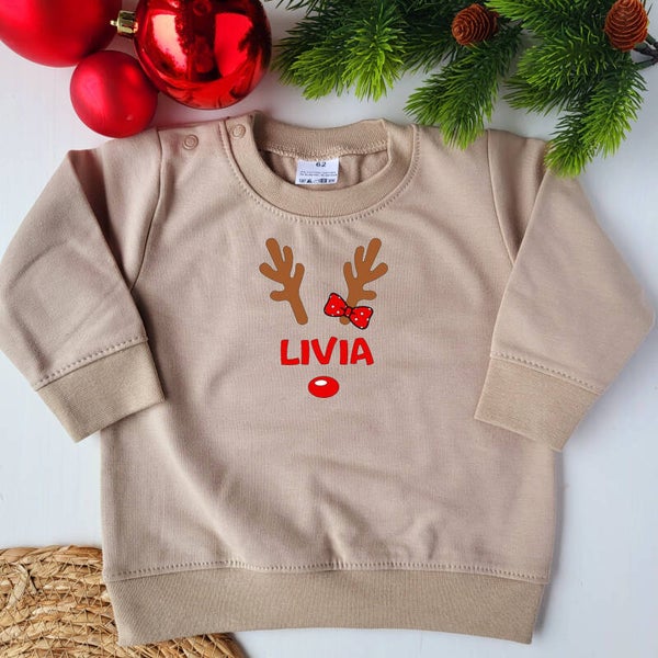 Een rendier gewei met een glimmende rode neus en daar tussen de naam van je kindje. Hoe leuk als 1e kersttruitje.