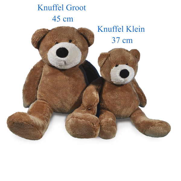 Deze knuffel, die 45 cm groot is, is de grote broer (of zus) van de kleine knuffel van 37 cm. Ook deze aap of beer is heerlijk zacht en draagt een ecru kleurig t-shirtje met de naam en geboortedatum van de baby.
