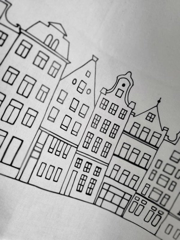 Set van twee theedoeken met een bedrukt motief van een rijtje grachtenhuisjes.